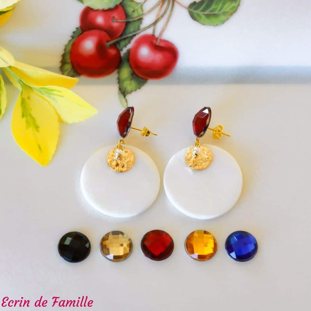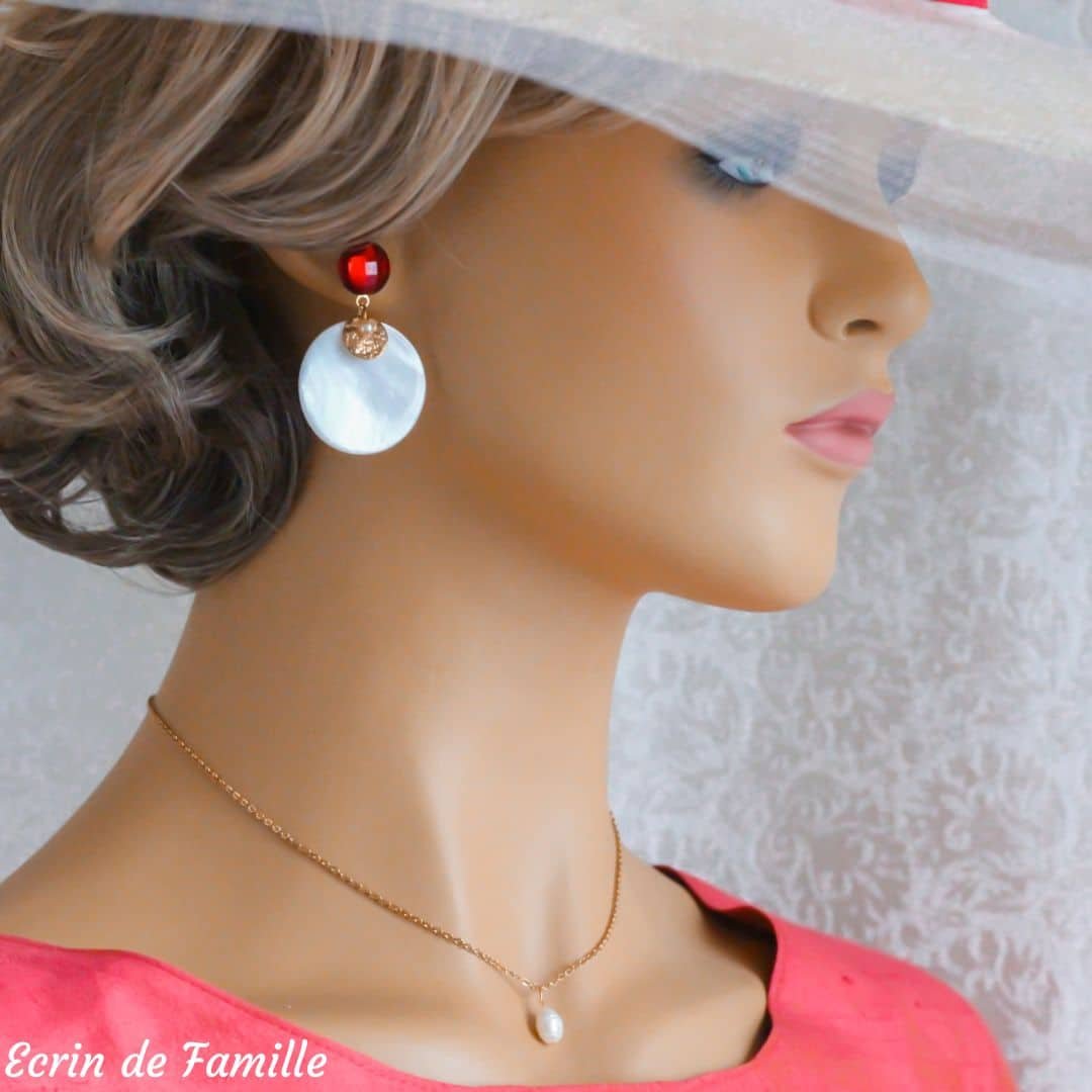 Boucles d’oreilles montées sur un clou orné d’un petit cabochon de couleur bombé à facettes. Elles sont habillées d’un grand sequin en nacre blanche, d’un pendentif martelé doré et d’une petite perle nacrée en verre de Bohême.