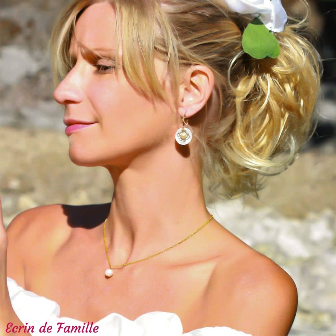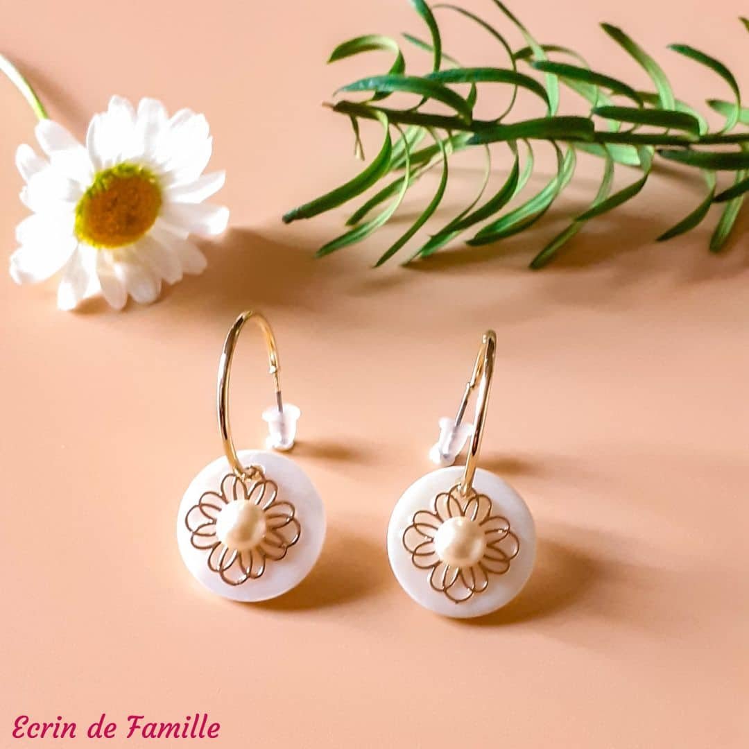 Boucles d’oreilles créoles dorées à l’or fin. Elles se composent d’un sequin en nacre naturelle, d’un pendentif doré en forme de fleur orné d’un cabochon rond nacré en verre de Bohême.