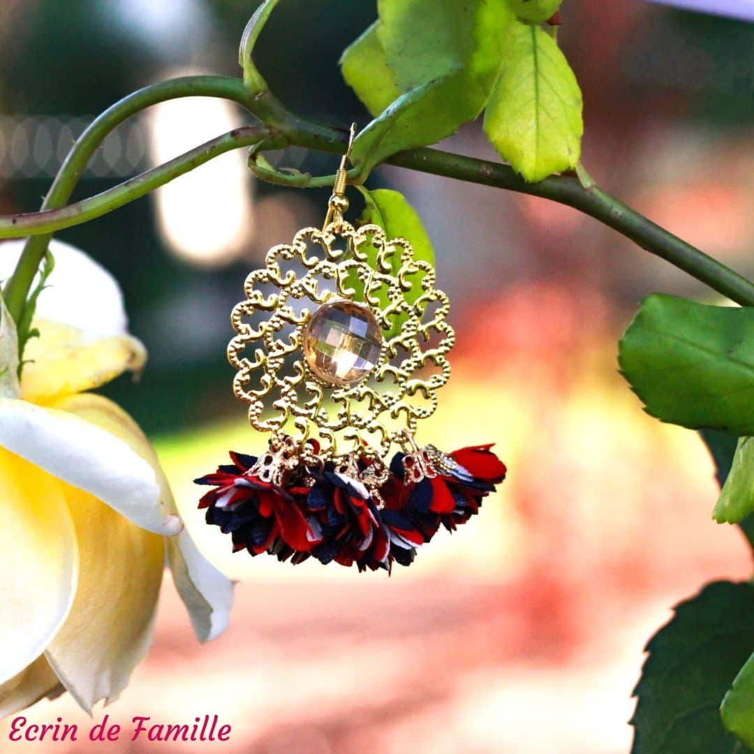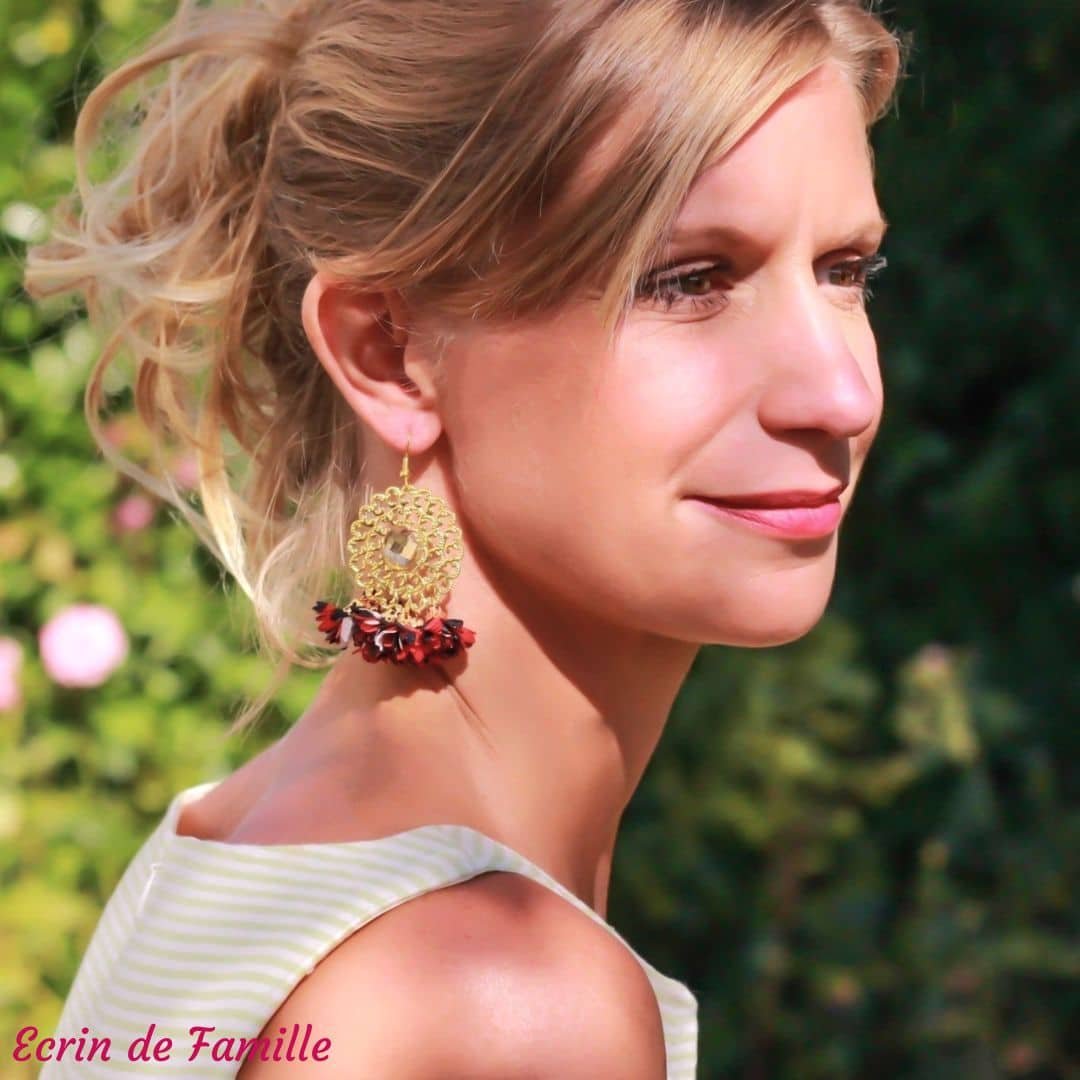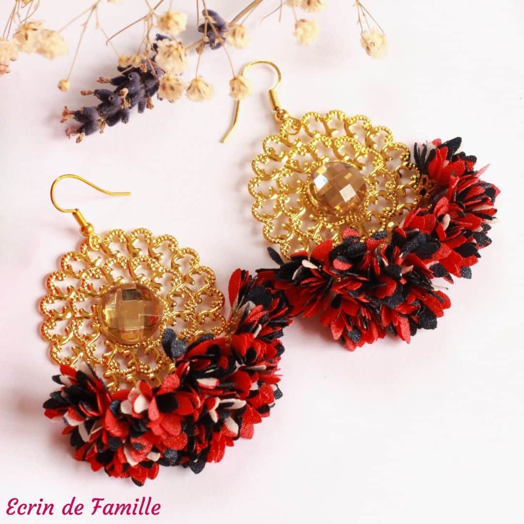 Boucles d’oreilles montées sur une attache dorée, ornées d’une estampe à volutes agrémentée d’un cabochon champagne à facettes et des pompons en tissu.