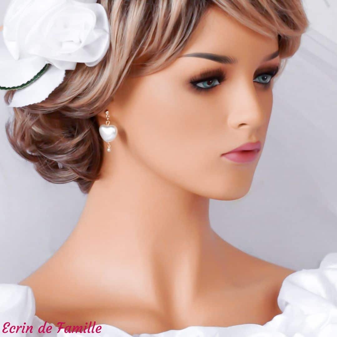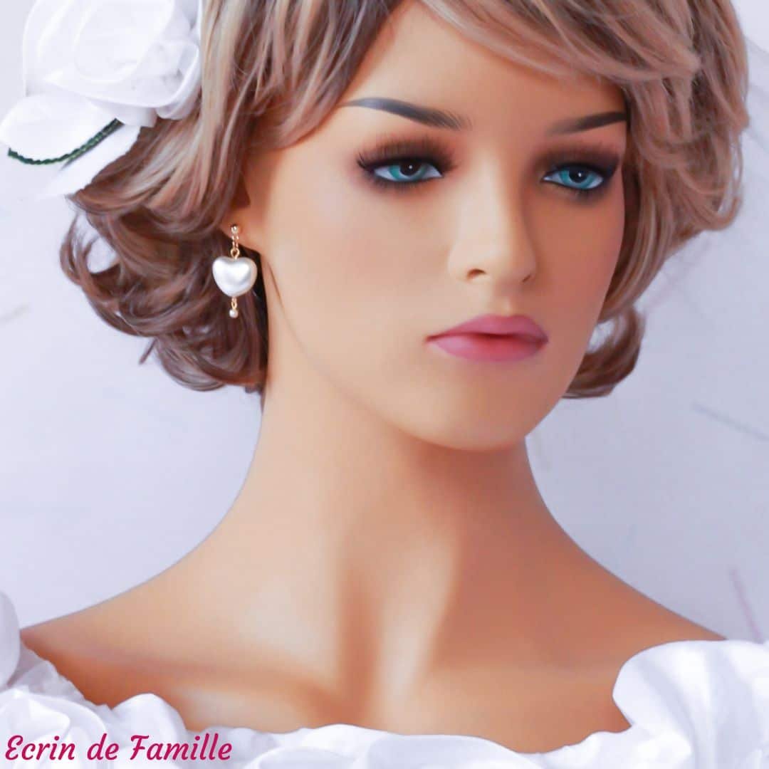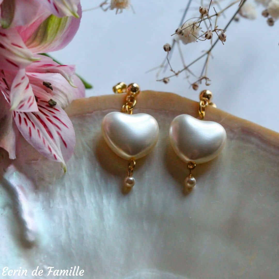 Boucles d’oreilles montées sur un clou doré à l’or fin 18K. Elles sont habillées d’une grand coeur nacré blanc et d’une petite perle nacrée blanche en verre de Bohême.