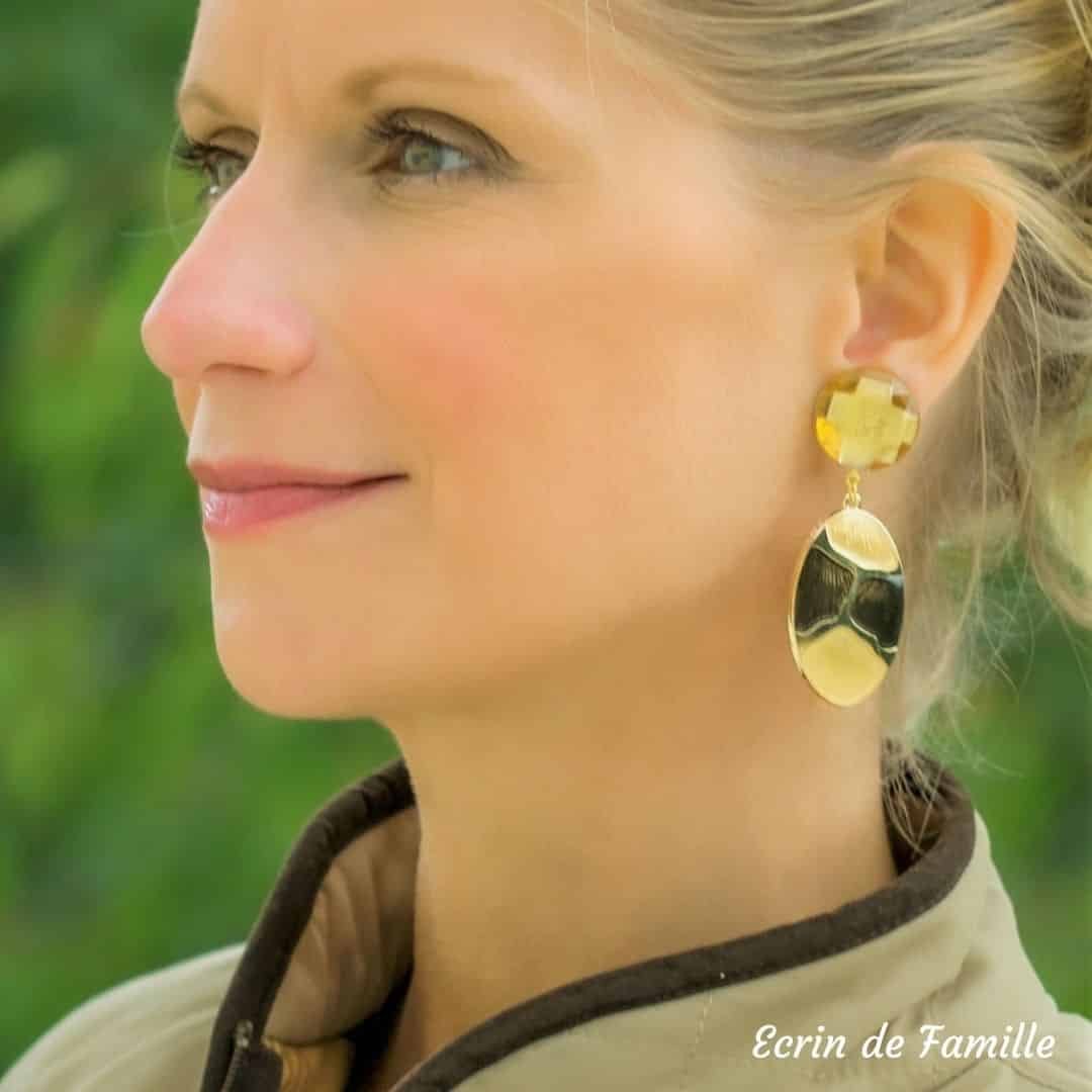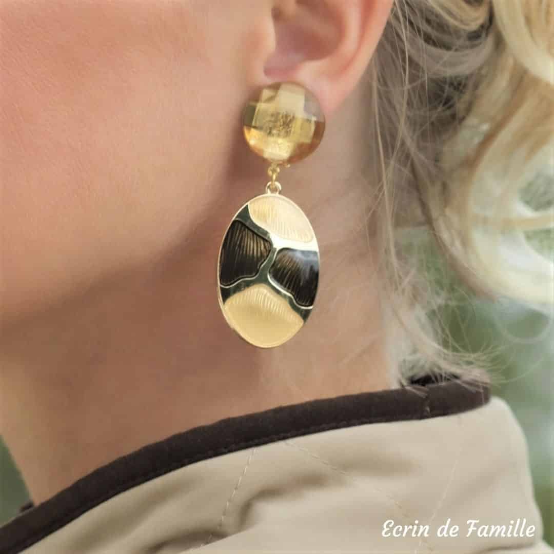 Boucles d’oreilles dorées montées sur clip avec un cabochon à facettes diamètre 20mm. Elles sont composées d’un grand pendentif ovale en résine. Ultra légères.