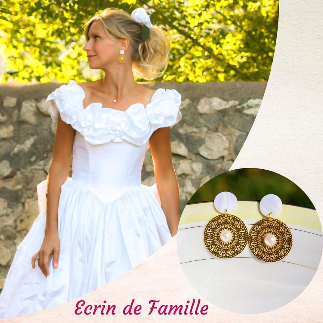 Boucles d’oreilles montées sur clou posé sur un sequin rond en nacre naturelle. Elles sont ornées d’une grande estampe filigranée en laiton doré avec en son centre un petit cabochon nacré blanc.