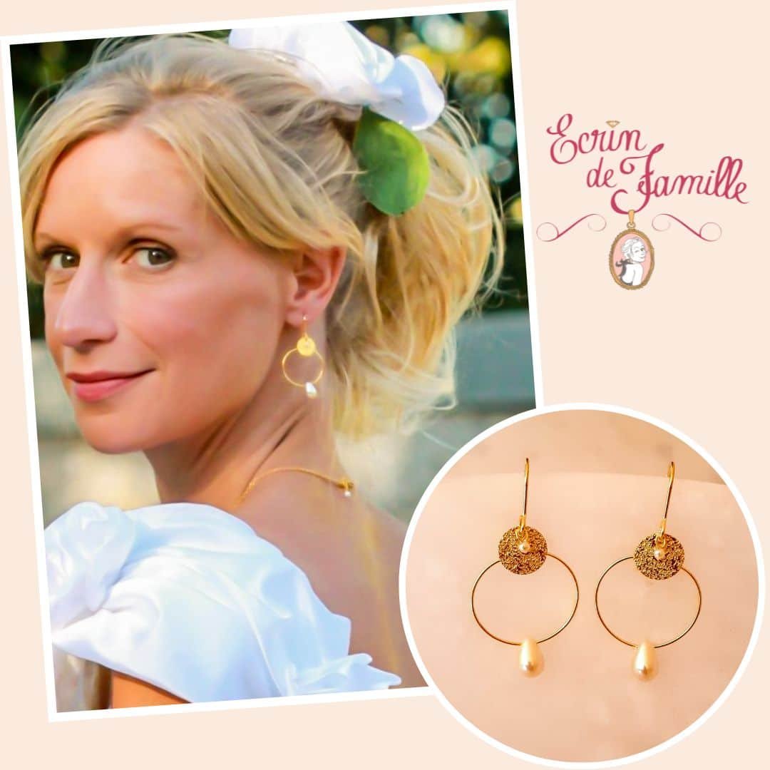 Boucles d’oreilles montées sur une attache en plaqué or. Elles sont habillées d’une fine créole dorée à l’or fin ornée d’une goutte nacrée, d’un sequin pailleté doré et d’une petite perle nacrée blanche en verre de Bohême.
