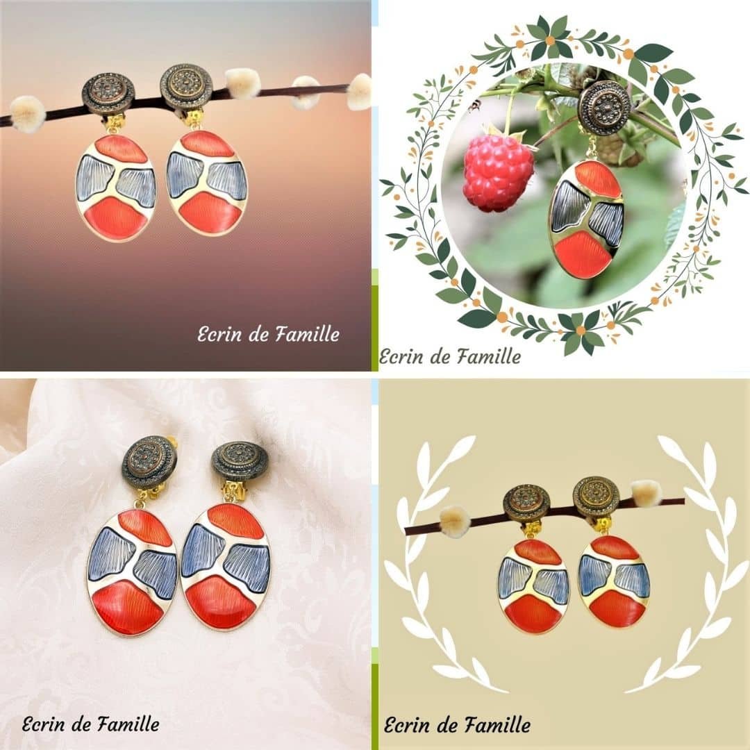 Boucles d’oreilles composées d’un grand pendentif ovale en résine bicolore et montées sur un clip rond ouvragé. Ultra légères.