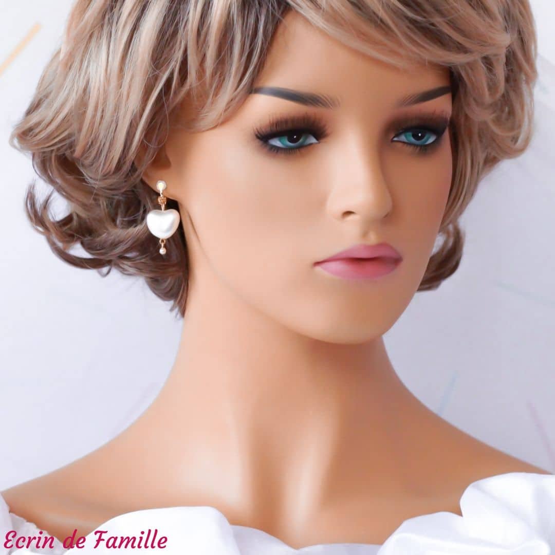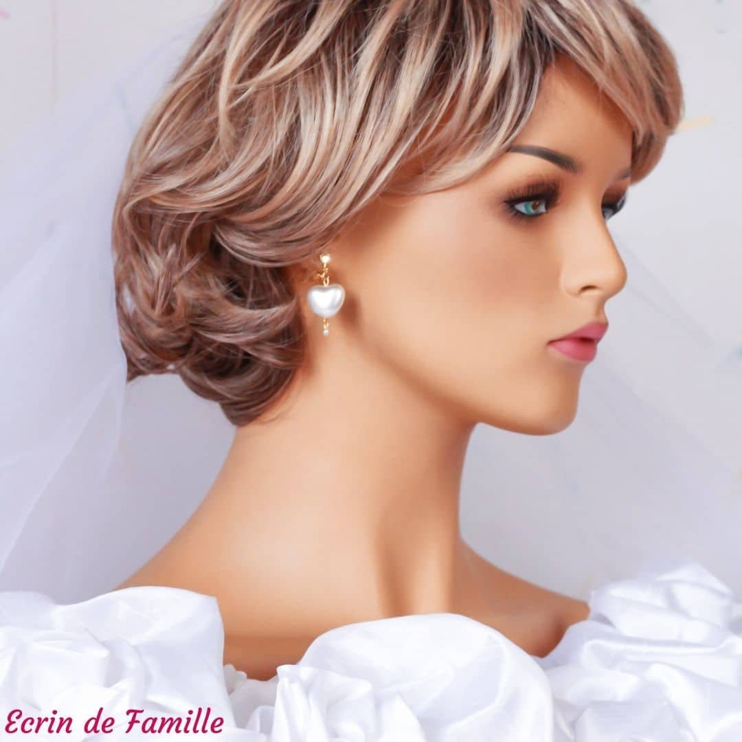 Boucles d’oreilles montées sur un petit clip à pince en laiton doré. Elles sont habillées d’une grand coeur nacré blanc et d’une petite perle nacrée blanche en verre de Bohême.
