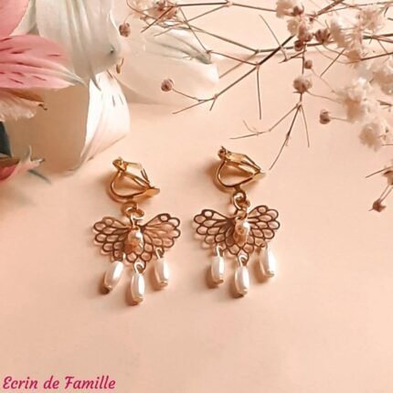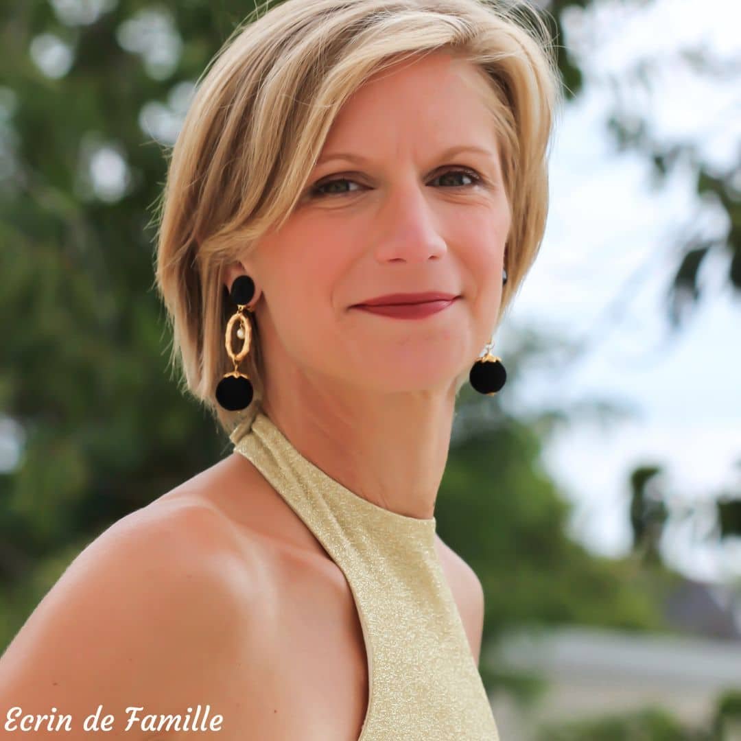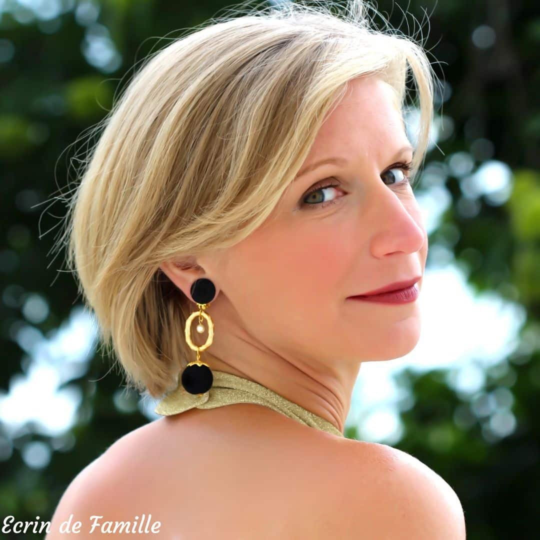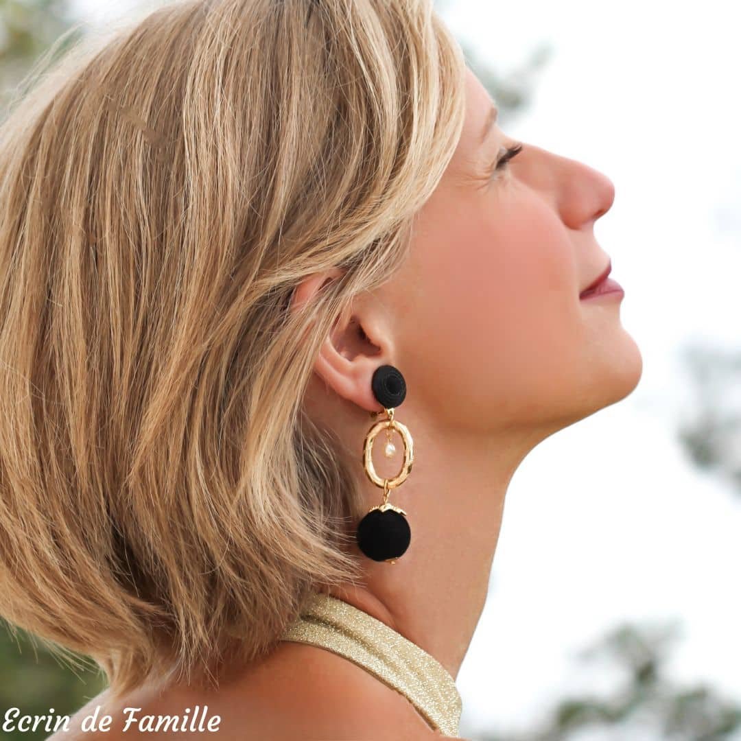 Un anneau allongé ciselé doré en résine traitée anti-oxydation, une perle nacrée en verre de Bohême et une grande perle noire au toucher velours ornée d’une collerette dorée. Au choix 2 clips : un clip orné d’un cabochon noir légèrement bombé aspect tissu, ou un clip orné d’un camée blanc sur fond noir.