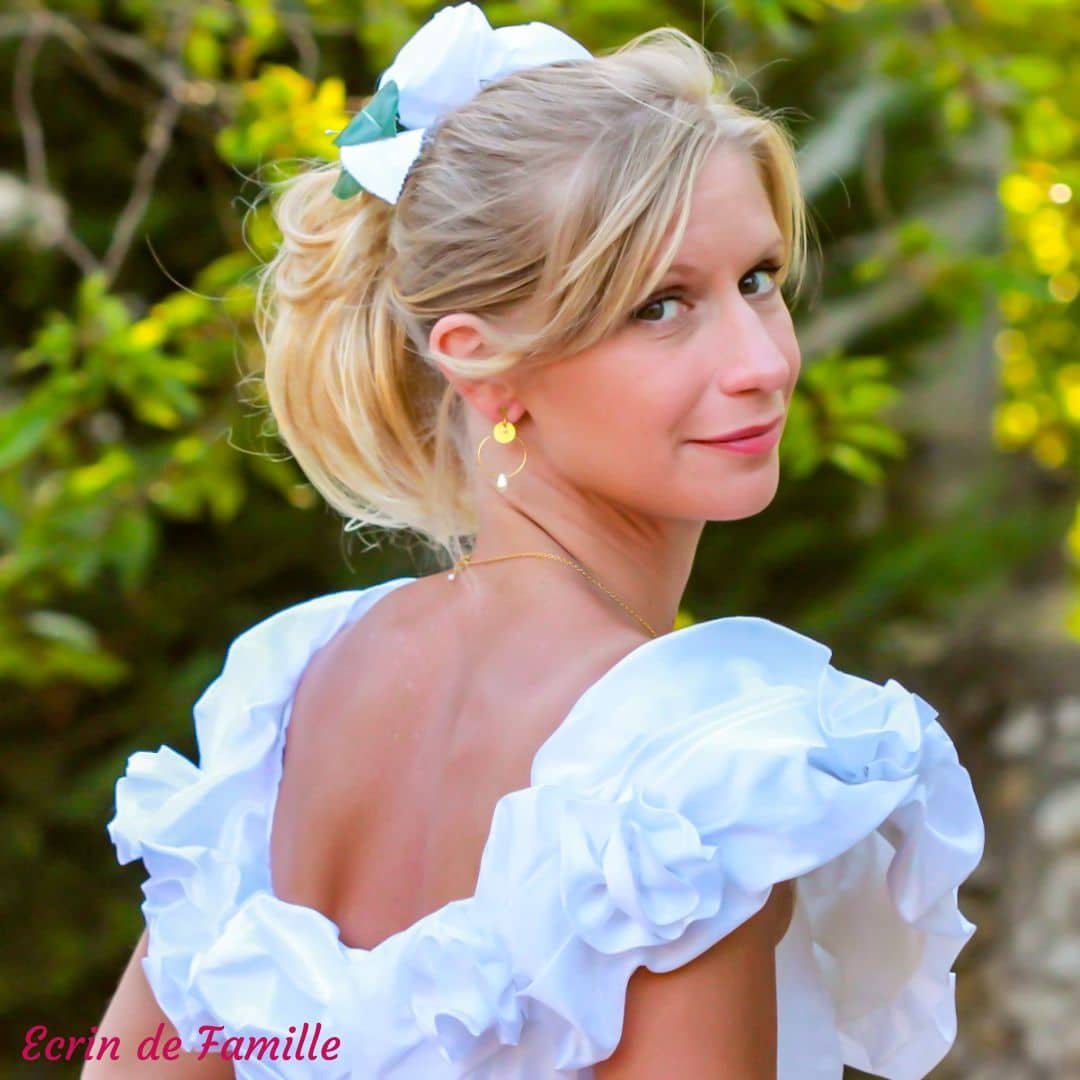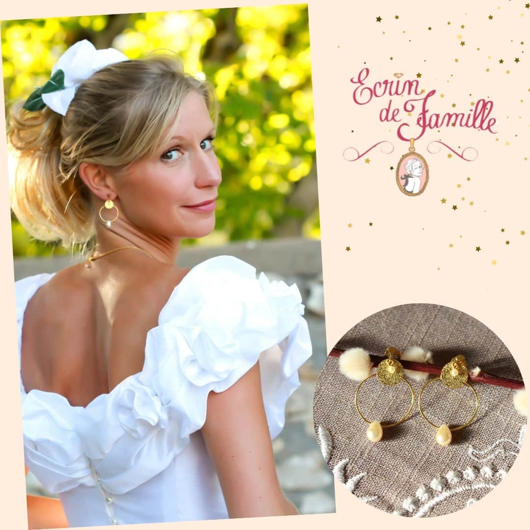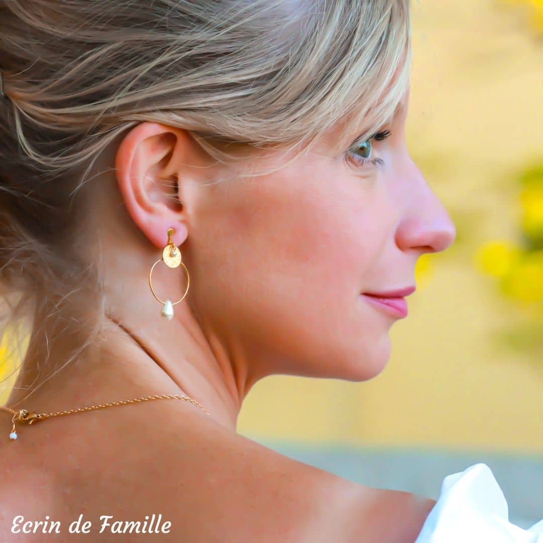 Boucles d’oreilles montées sur un petit clip doré à pince. Elles sont habillées d’une fine créole dorée à l’or fin ornée d’une goutte nacrée, d’un sequin pailleté doré et d’une petite perle nacrée blanche en verre de Bohême.